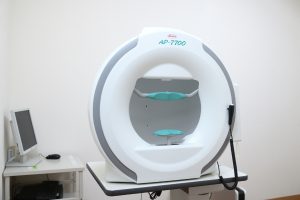 検査は、専用の機器を使用して行います。患者様は検査装置の前で一点を見つめ、視野内に点滅する光を感じたらボタンを押すだけです。光の明るさや位置が変化するため、どの範囲がどれだけ見えているかがわかります。検査は片眼ずつ行い、通常15〜20分程度で終了します。